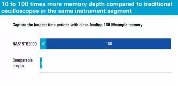 除帶寬和采樣率指標(biāo)外,波形的記錄長度是示波器最重要的性能指標(biāo),它決定了一臺(tái)示波器對(duì)信號(hào)測試和故障排查的測試覆蓋能力。R&S RTB2000系列示波器標(biāo)配了業(yè)內(nèi)領(lǐng)先的每通道10M點(diǎn)波形記錄長度,在半通道交織模式下可達(dá)每通道20M點(diǎn)。這意味著RTB2000系列示波器具備與同級(jí)別示波器相比十倍以上的記錄長度。用戶可以利用這一特性在信號(hào)測試和故障排查時(shí)以高采樣率捕獲更長時(shí)間跨度的波形過程,幫助用戶對(duì)被測信號(hào)進(jìn)行更深入的了解。不僅如此,在分段存儲(chǔ)選件的支持下,標(biāo)配的記錄長度還可以被進(jìn)一步擴(kuò)充至160M。