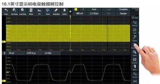 R&S RTB2000系列示波器配備了令人印象深刻的10.1英寸彩色電容觸摸屏。示波器的視覺體驗(yàn)是非常重要的環(huán)節(jié),用戶在日常工作中使用示波器很大部分時(shí)間用于觀測儀器的顯示。R&S RTB2000系列示波器提供了兩倍于同級(jí)別示波器的顯示屏幕大小和十倍于同級(jí)別示波器的顯示像素分辨率,幫助用戶更好地觀測被測信號(hào)。電容觸屏控制使用戶可以更快捷有效地完成示波器的操作。R&S RTB2000系列示波器的面世使用戶第一次可以在較低的預(yù)算下獲得大尺寸顯示和電容觸屏控制的示波器。
