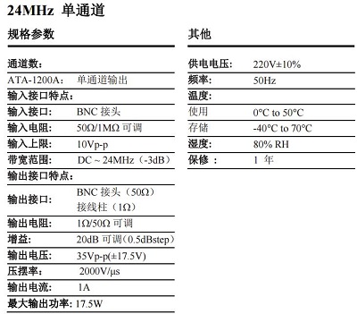 ATA-1200A是一款理想的可放大交、直流信號(hào)的單通道寬帶放大器。帶寬DC ~ 24MHz(-3dB),輸出35Vp-p (±17.5V)電壓,輸出電流 1A,可與主流的信號(hào)發(fā)生器配套使用,實(shí)現(xiàn)信號(hào)的完美放大。并且具有50Ω/1MΩ兩檔輸入電阻可選,完美匹配高低內(nèi)阻信號(hào)源。