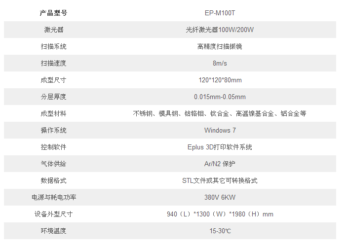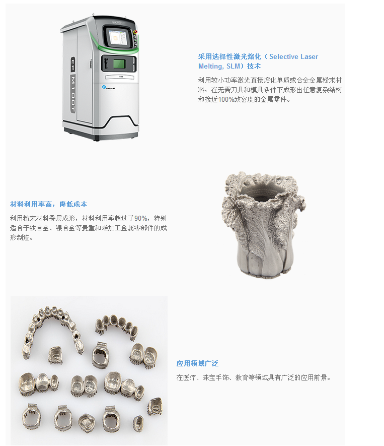 EP-M100T金屬3D打印機(jī)采取選擇性激光熔化(Selective Laser Melting, SLM)技術(shù)利用較小功率激光直接熔化單質(zhì)或合金金屬粉末材料,在無需刀具和模具條件下成形出任意復(fù)雜結(jié)構(gòu)和接近100%致密度的金屬零件。