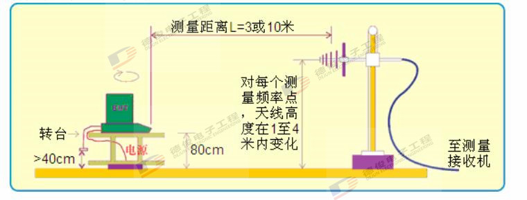 測量距離:是指 EUT 最接近天線的一點與天線的中心在地面上的投影間的距離。優(yōu)先采用 10 米法, 可選 3 米法。
